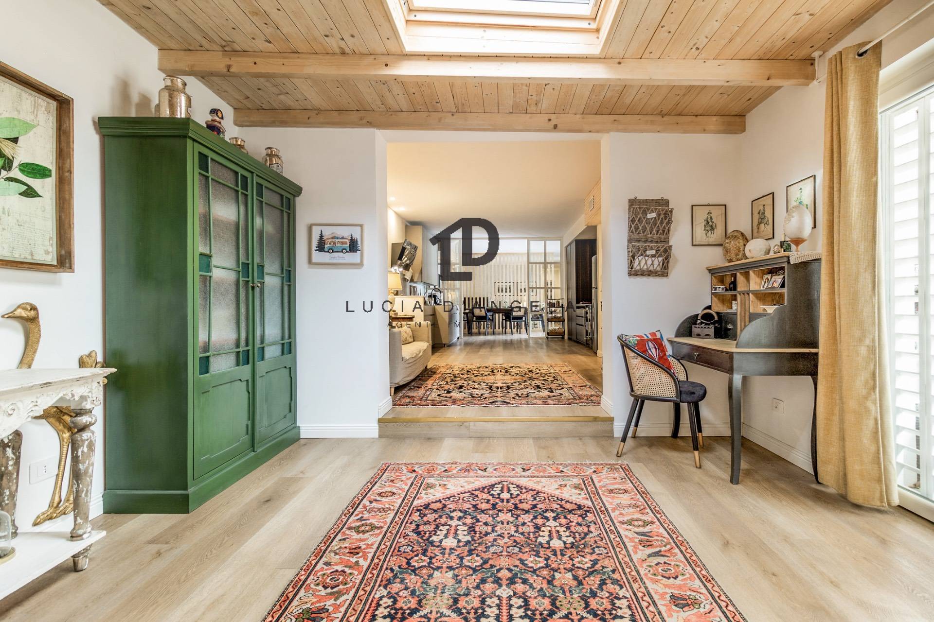 Attraversata la porta verde d'ingresso si accede a un ampio atrio, raffinato e ben illuminato. Il soffitto parzialmente in legno, arricchito da lucernari VELUX, permette alla luce naturale di filtrare dall'alto, conferendo luminosità e armonia agli spazi. Da qui si apre la zona giorno: un ambiente ampio , con una cucina su misura progettata da un famoso designer internazionale.